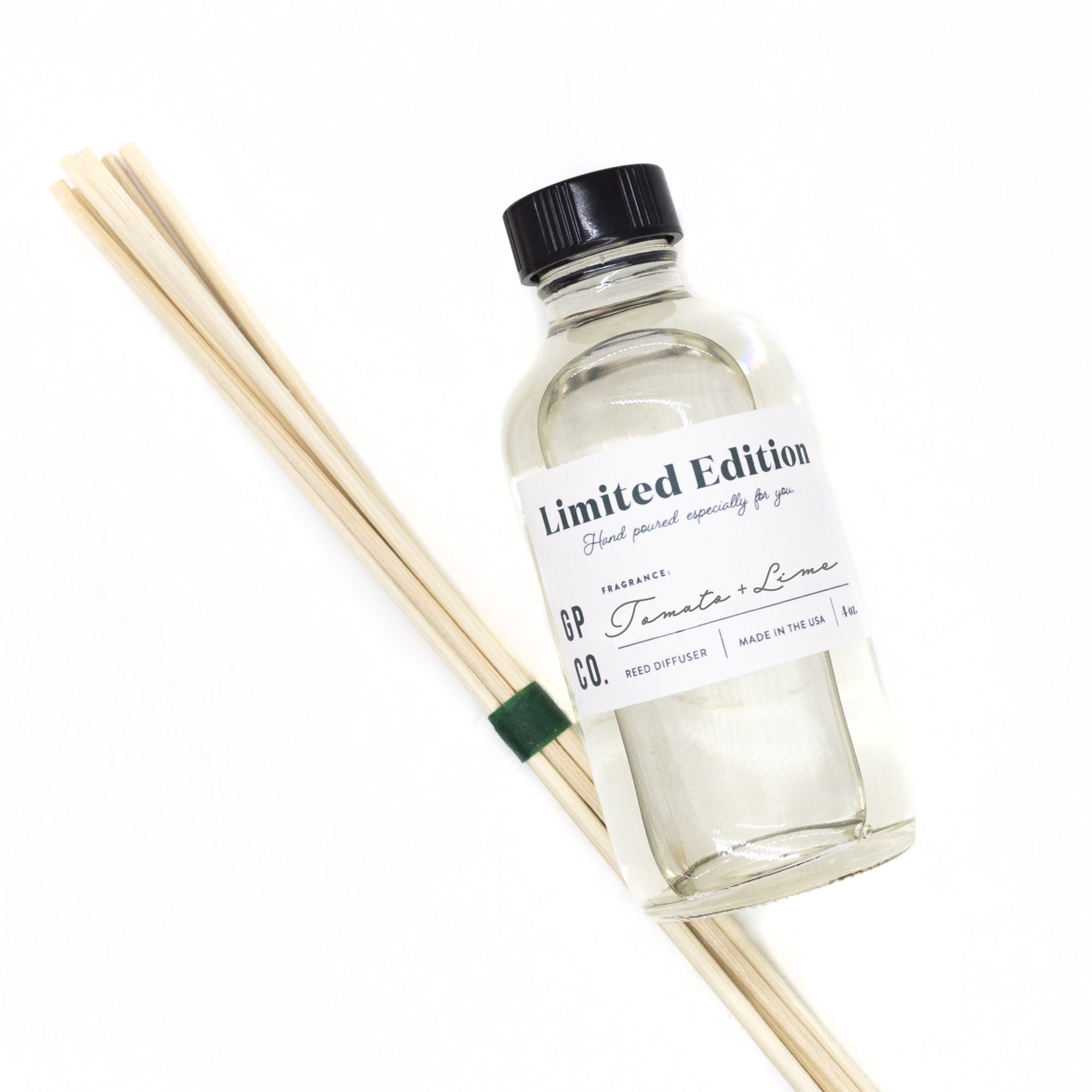 -Diffuser comes in 4 oz. clear glass bottle with eight natural reeds measuring 8.5".