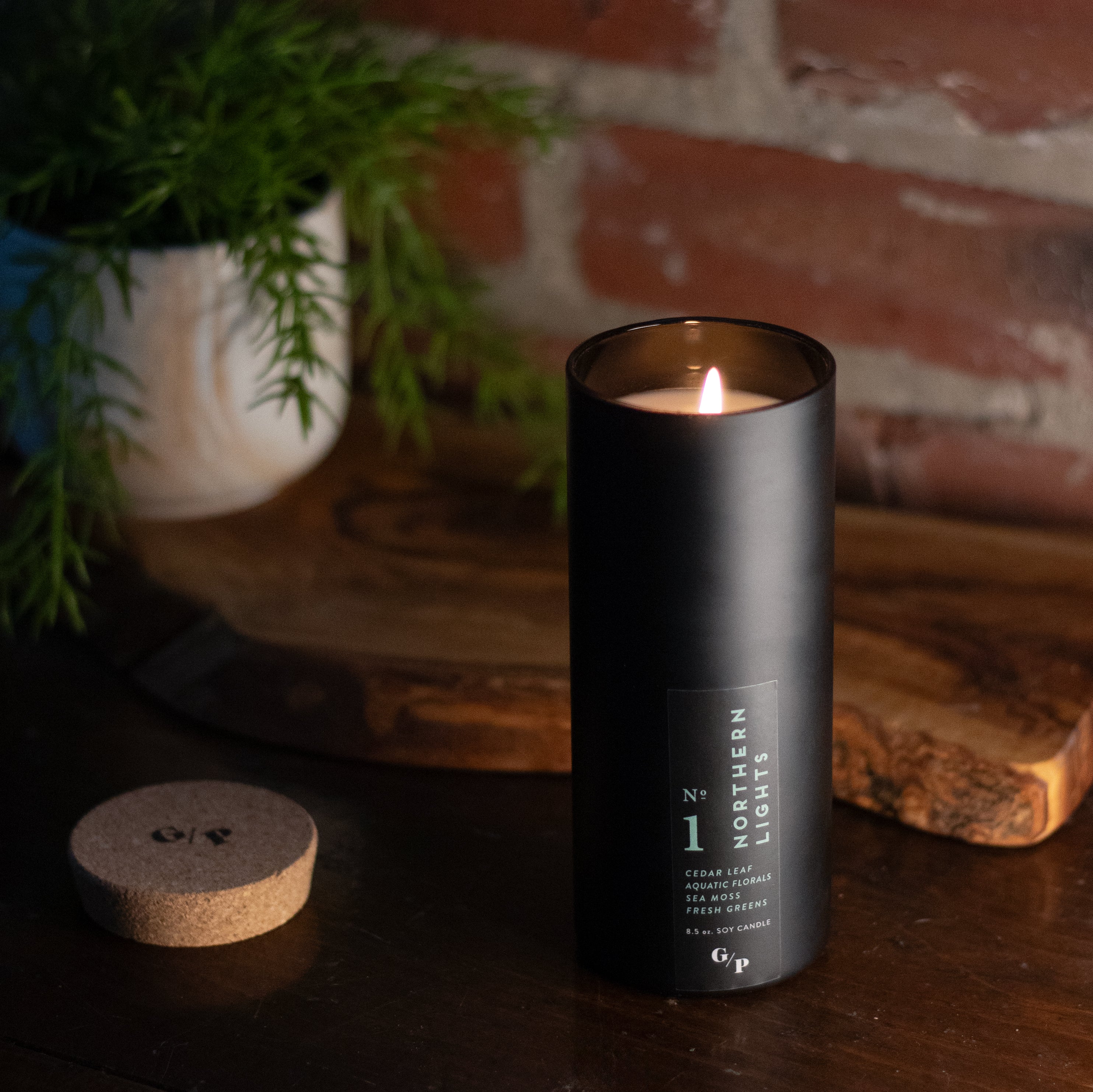 Candle is exclusively hand poured in a 8.5-ounce matte black glass jar with soy wax and packaged with a printed cork lid.