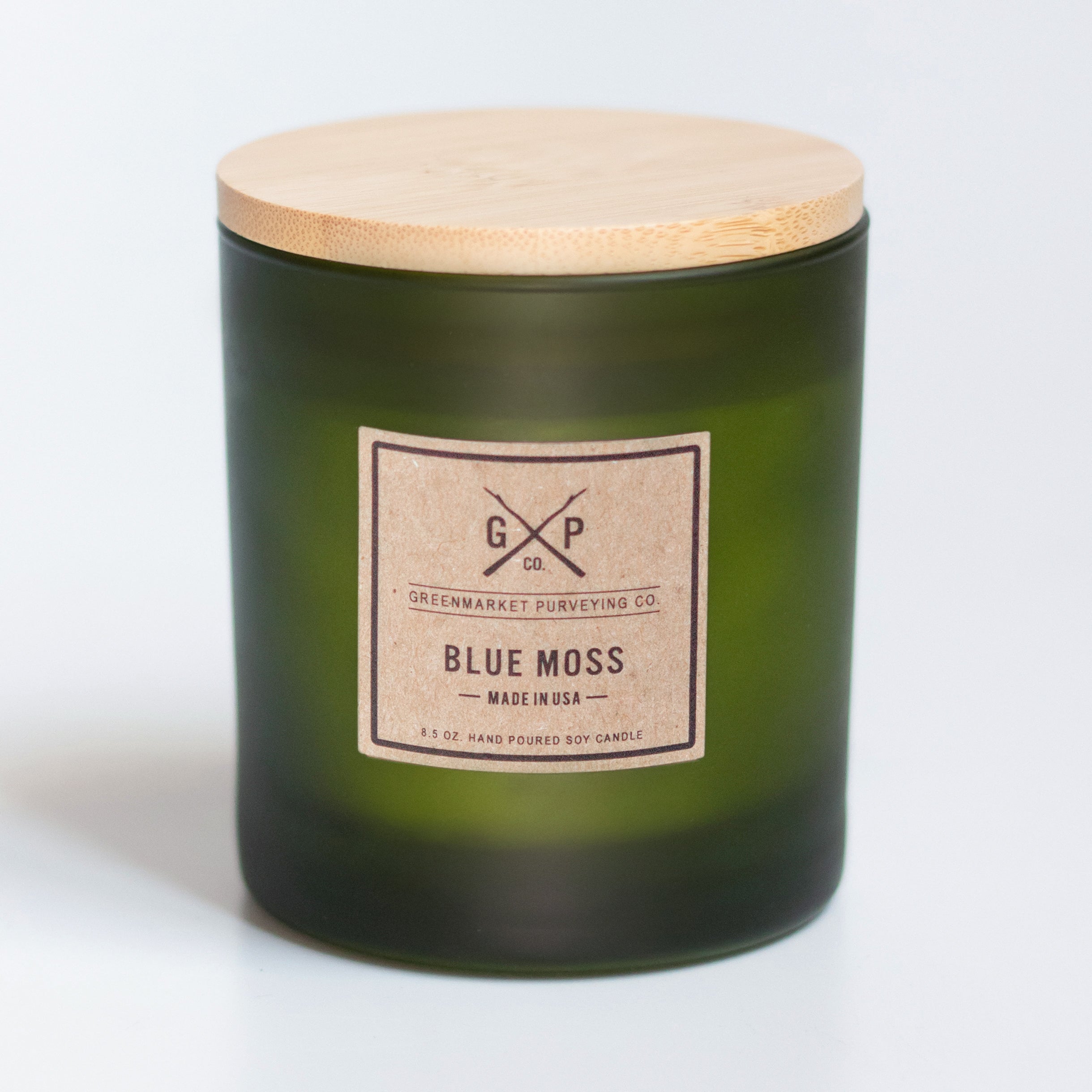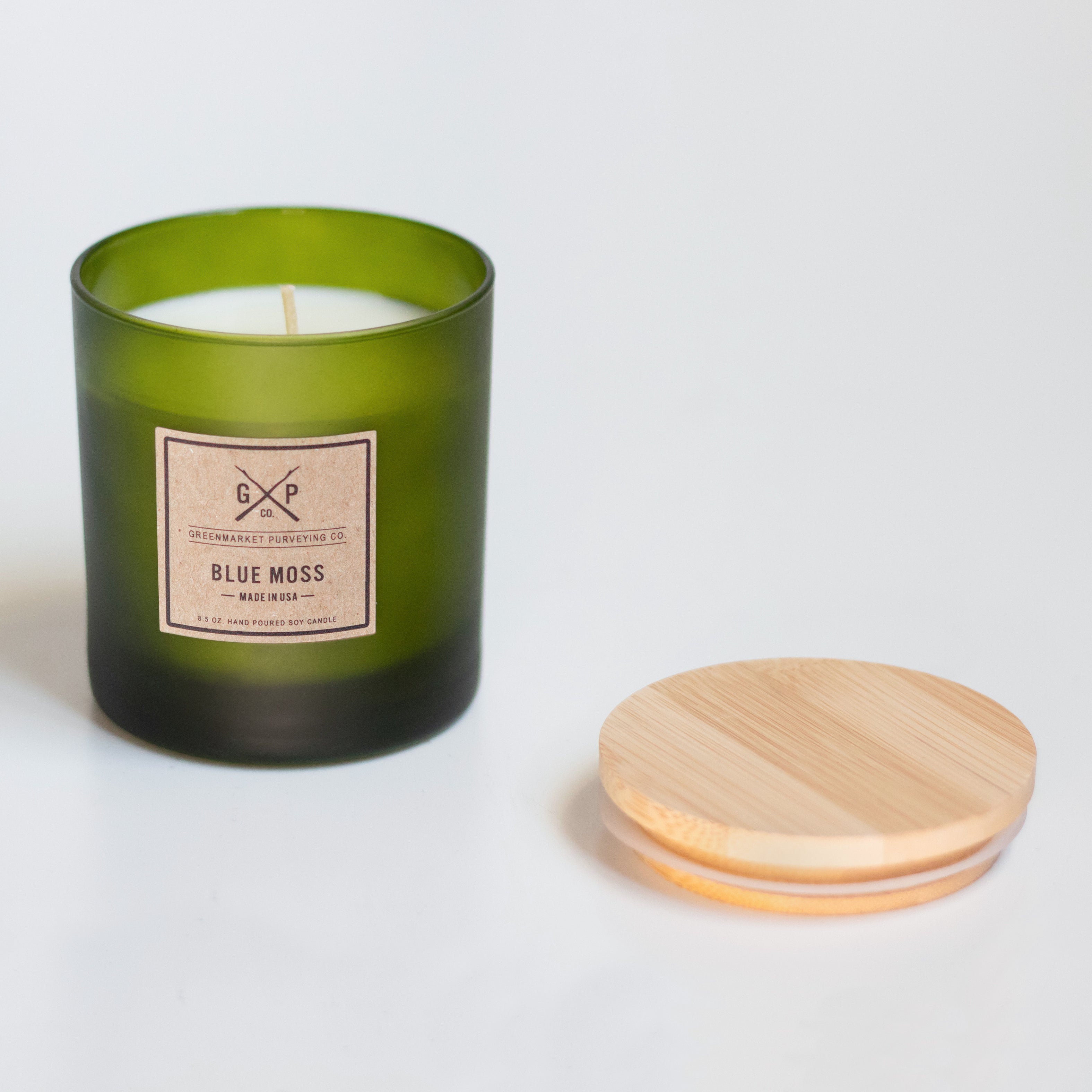 -8.5 oz. soy candle in a frosted green glass tumbler with a bamboo lid.