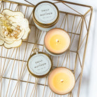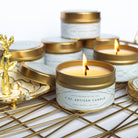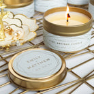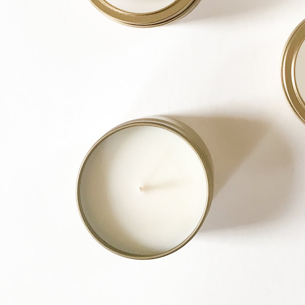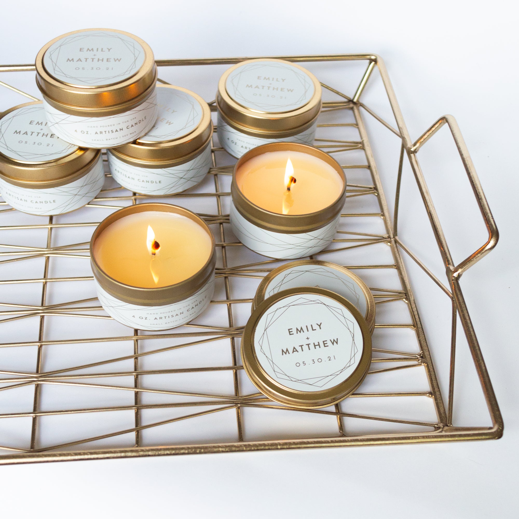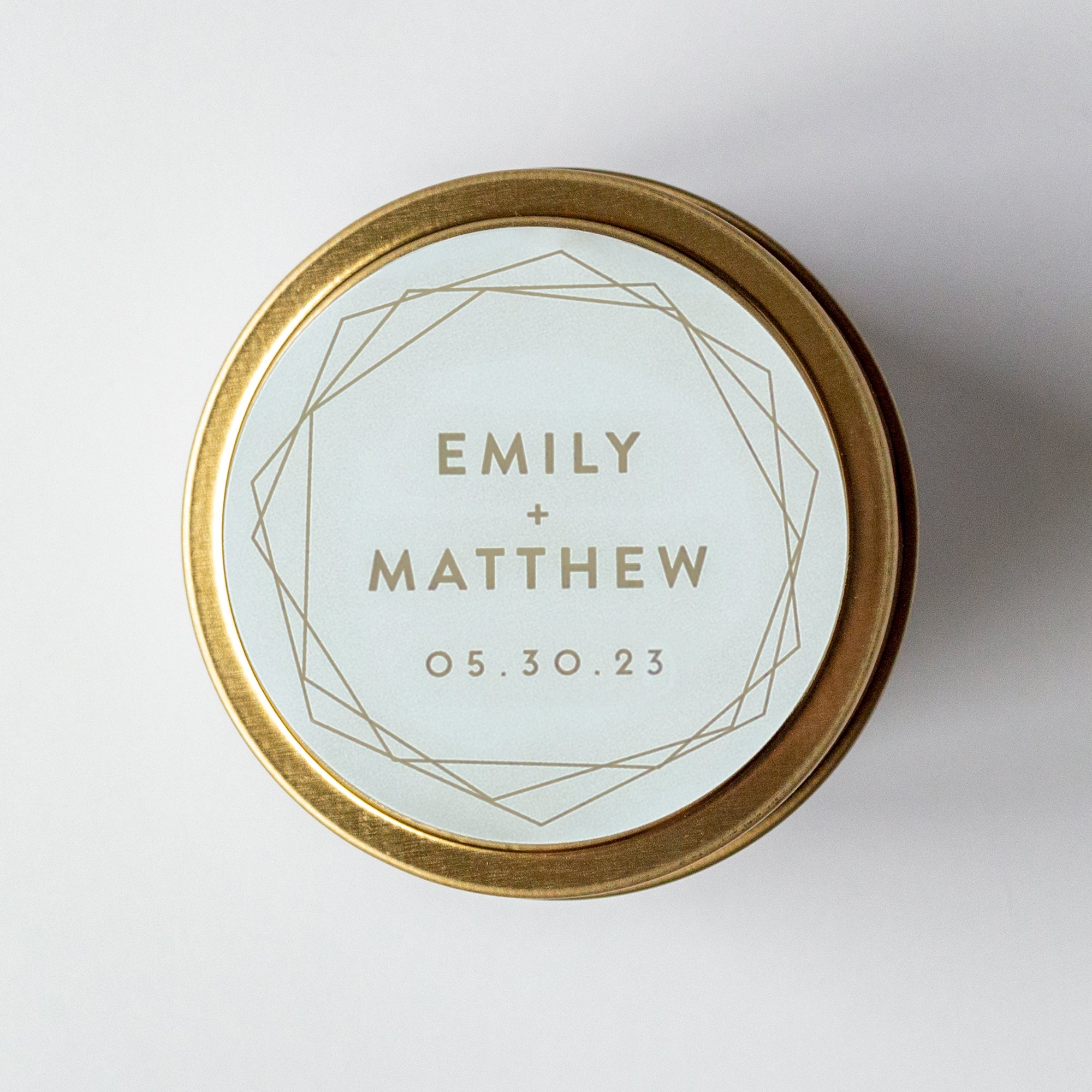 Each candle features a 4 oz. gold tin with lid. On the lid is a white circular label with a geometric design, your names and your special event date. On the side of the tin is a white full-wrap label with candle information. Our warning label is on the bottom of the tin. Choose from metallic gold ink or black ink.