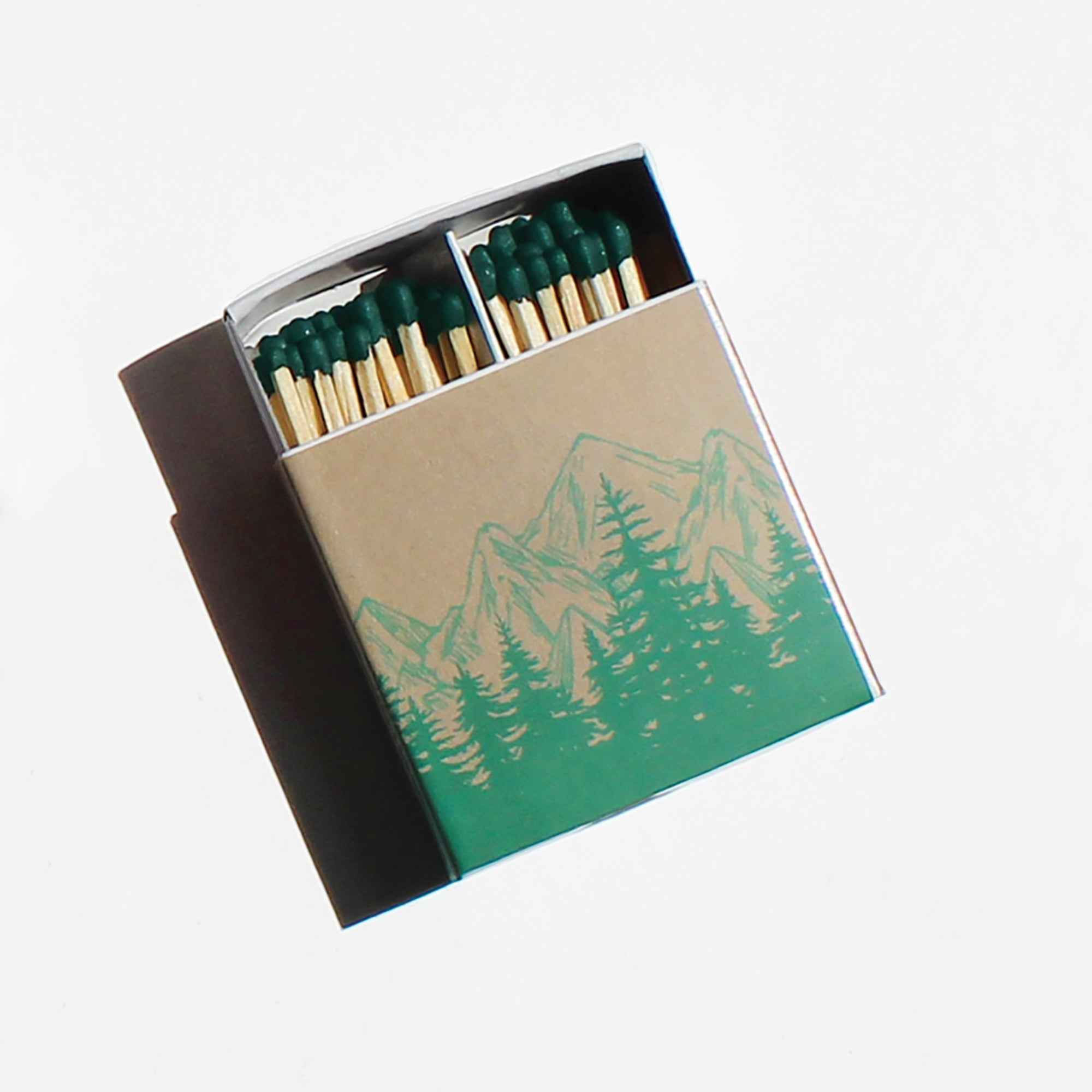 Matchboxes feature a kraft brown and dark green mountain illustration, with a sliding tray that contains approximately 75 dark green tipped safety strike matches per box. Each matchbox is individually shrink-wrapped.