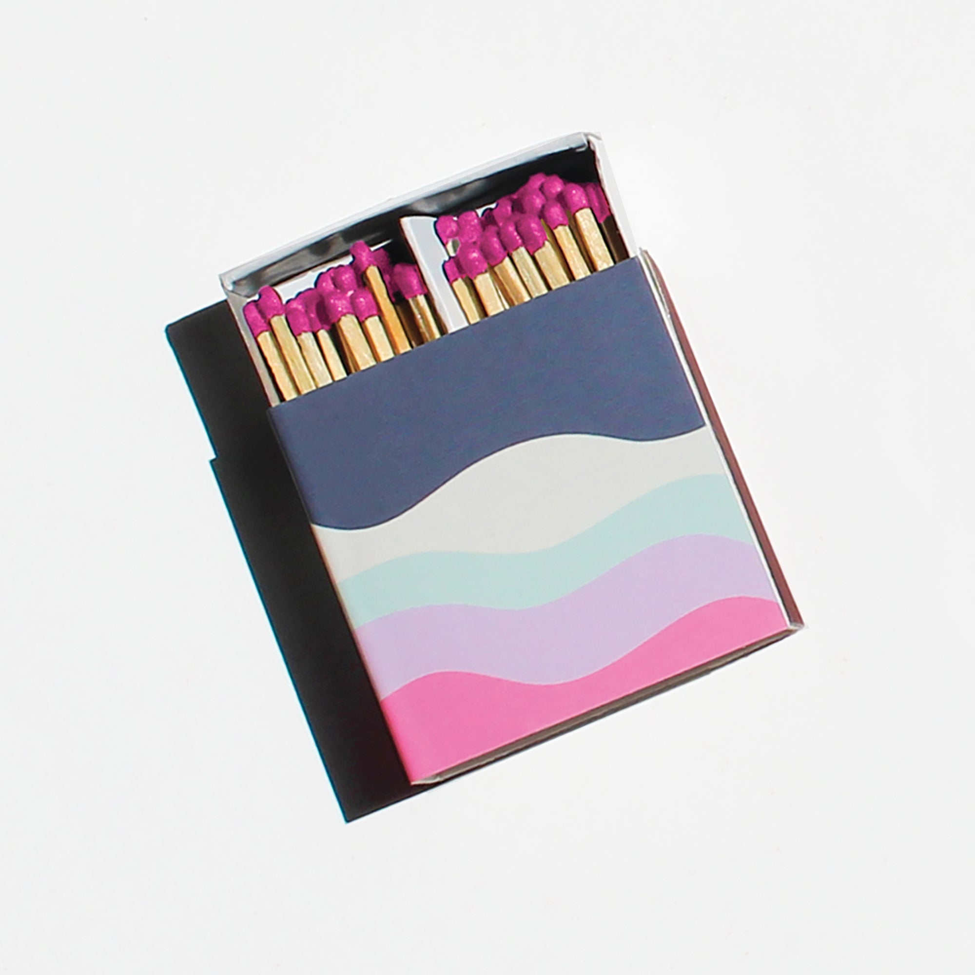 Matchboxes feature a magenta, purple and white squiggle illustration, with a sliding tray that contains approximately 75 magenta tipped safety strike matches per box. Each matchbox is individually shrink-wrapped.