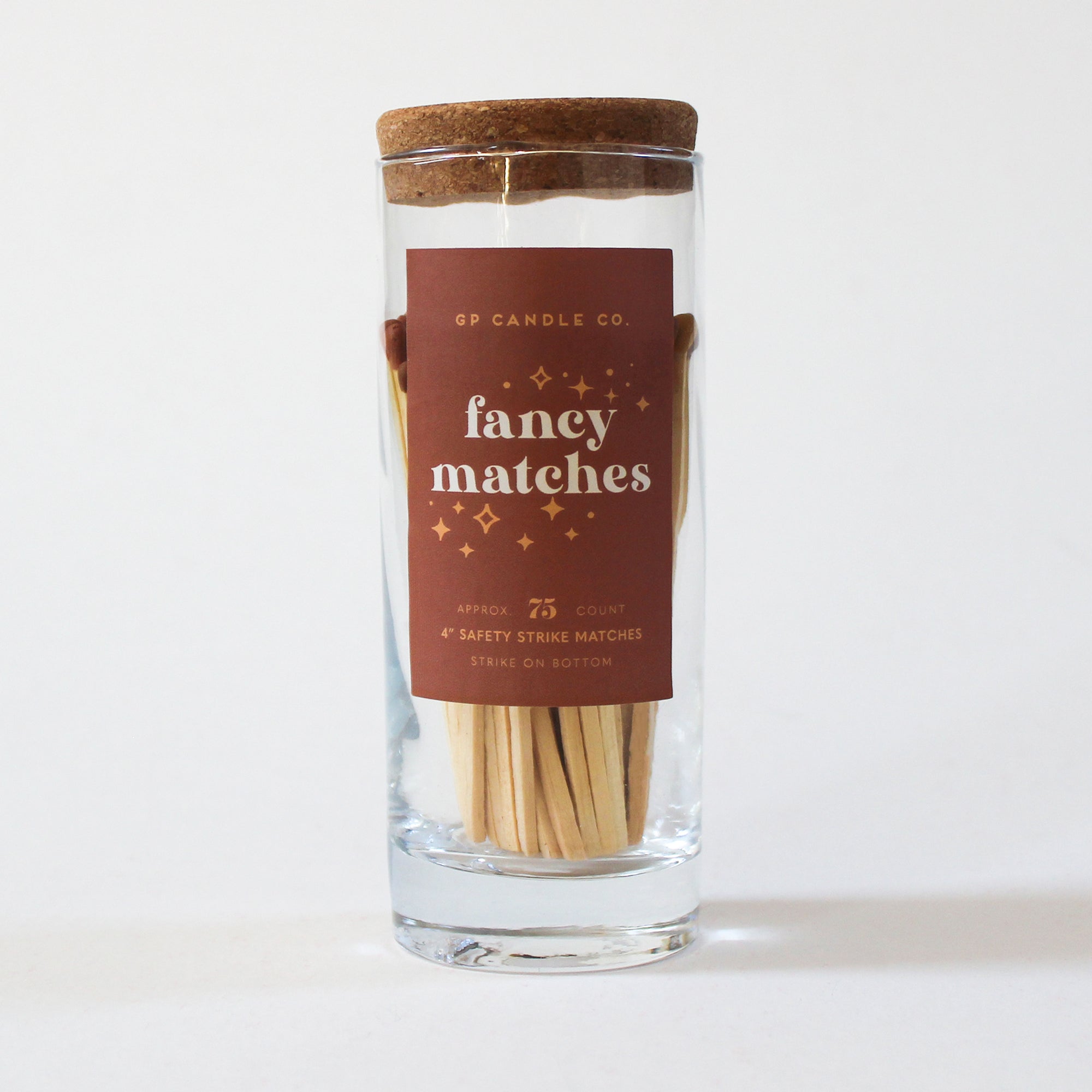 Approximately 75 4-inch safety strike matches with mixed earth toned tips packaged in a clear glass jar with printed cork lid. Striker is located on the bottom of the jar.