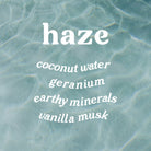 Haze features a fresh aquatic blend of ozonic sweetness, citrus, vanilla, geranium and coconut water.
