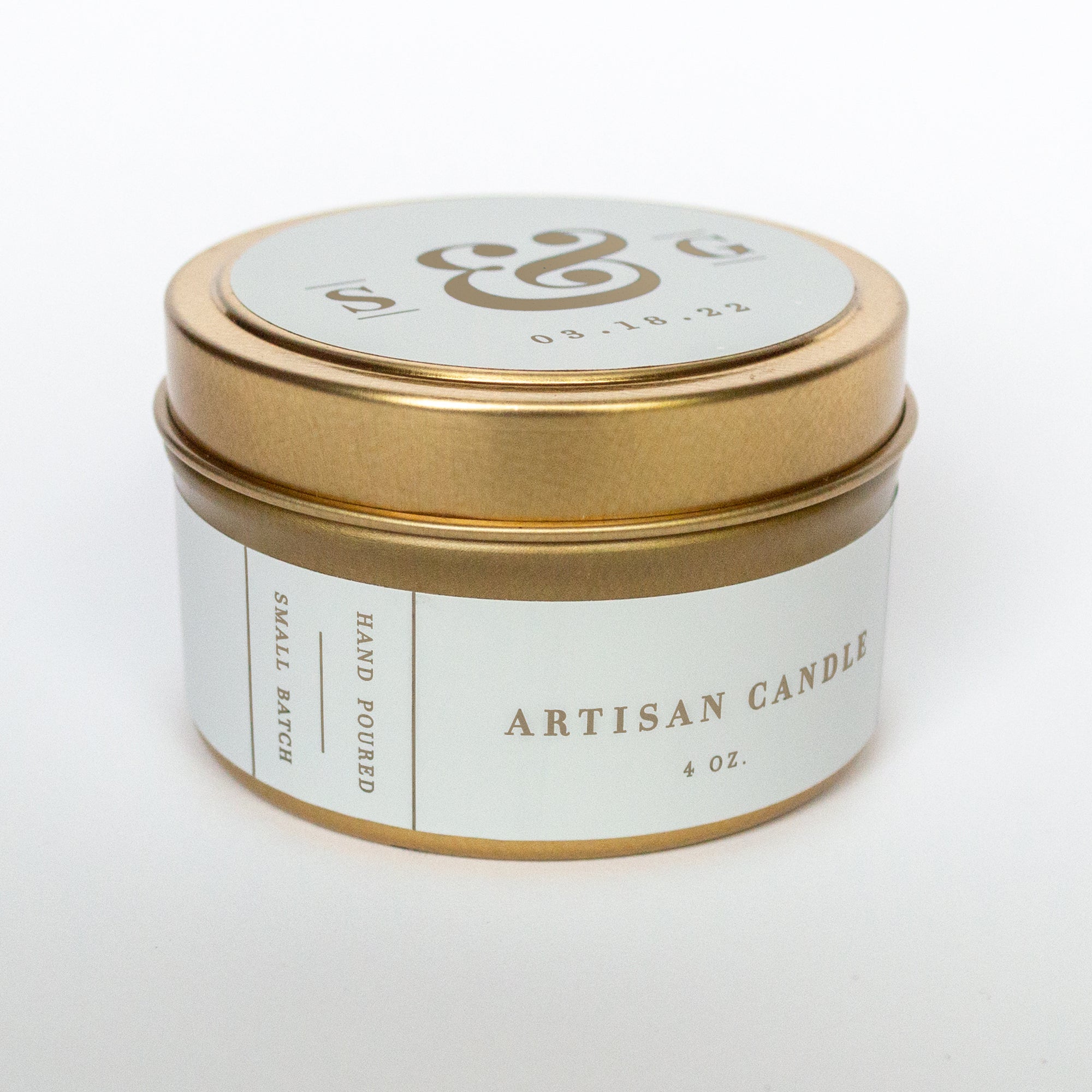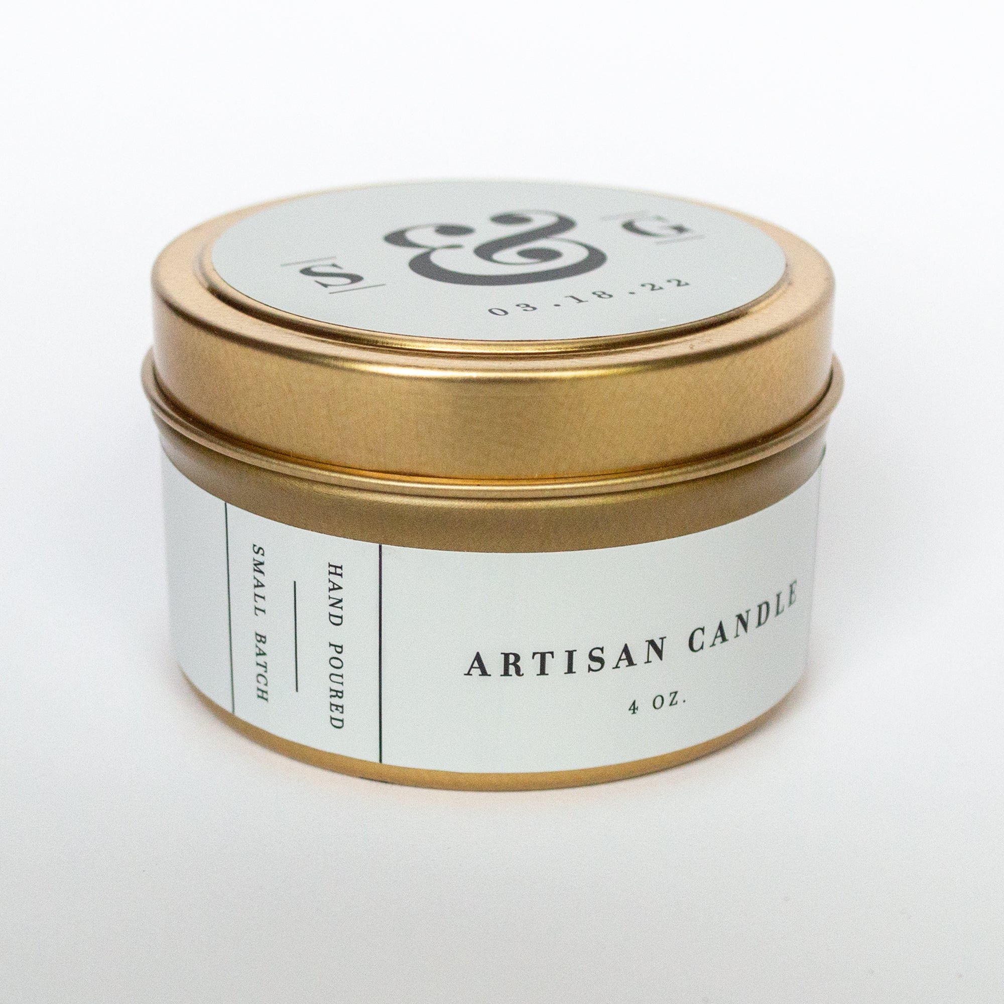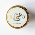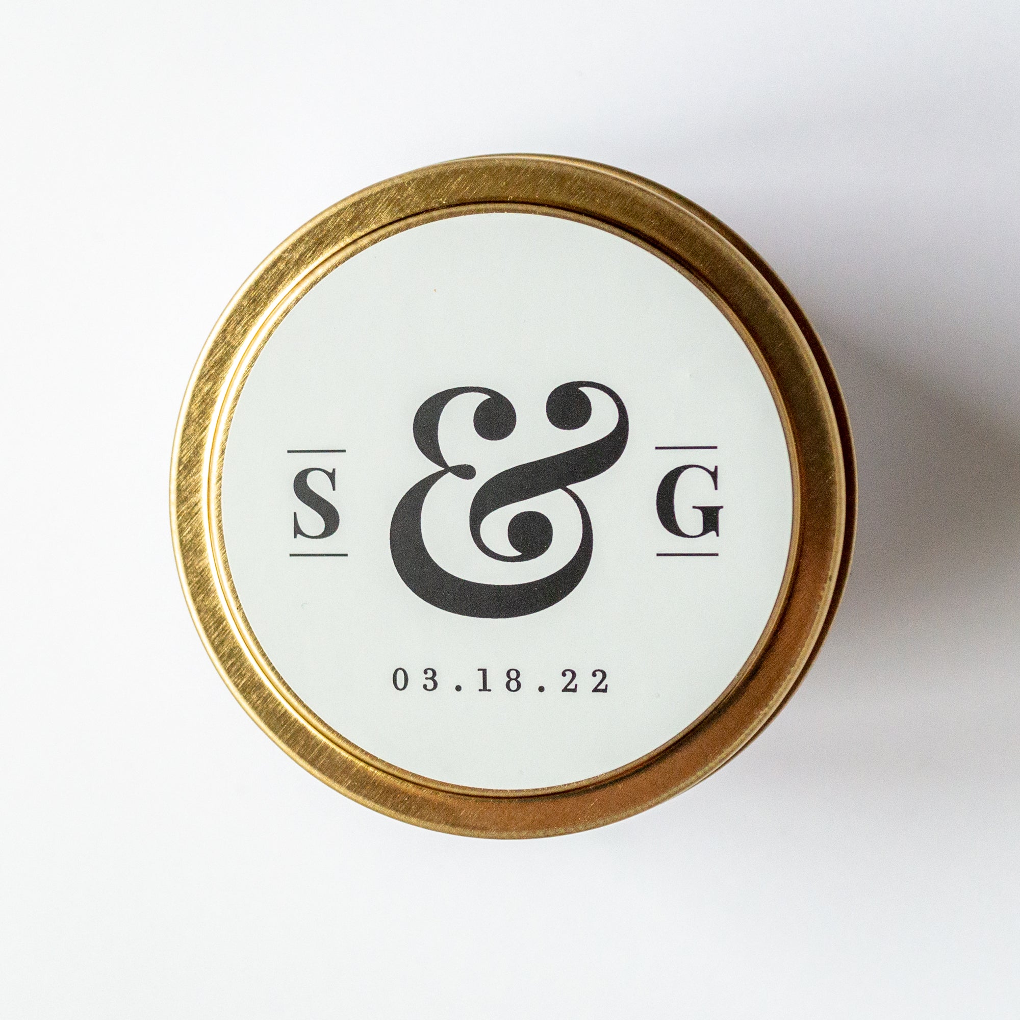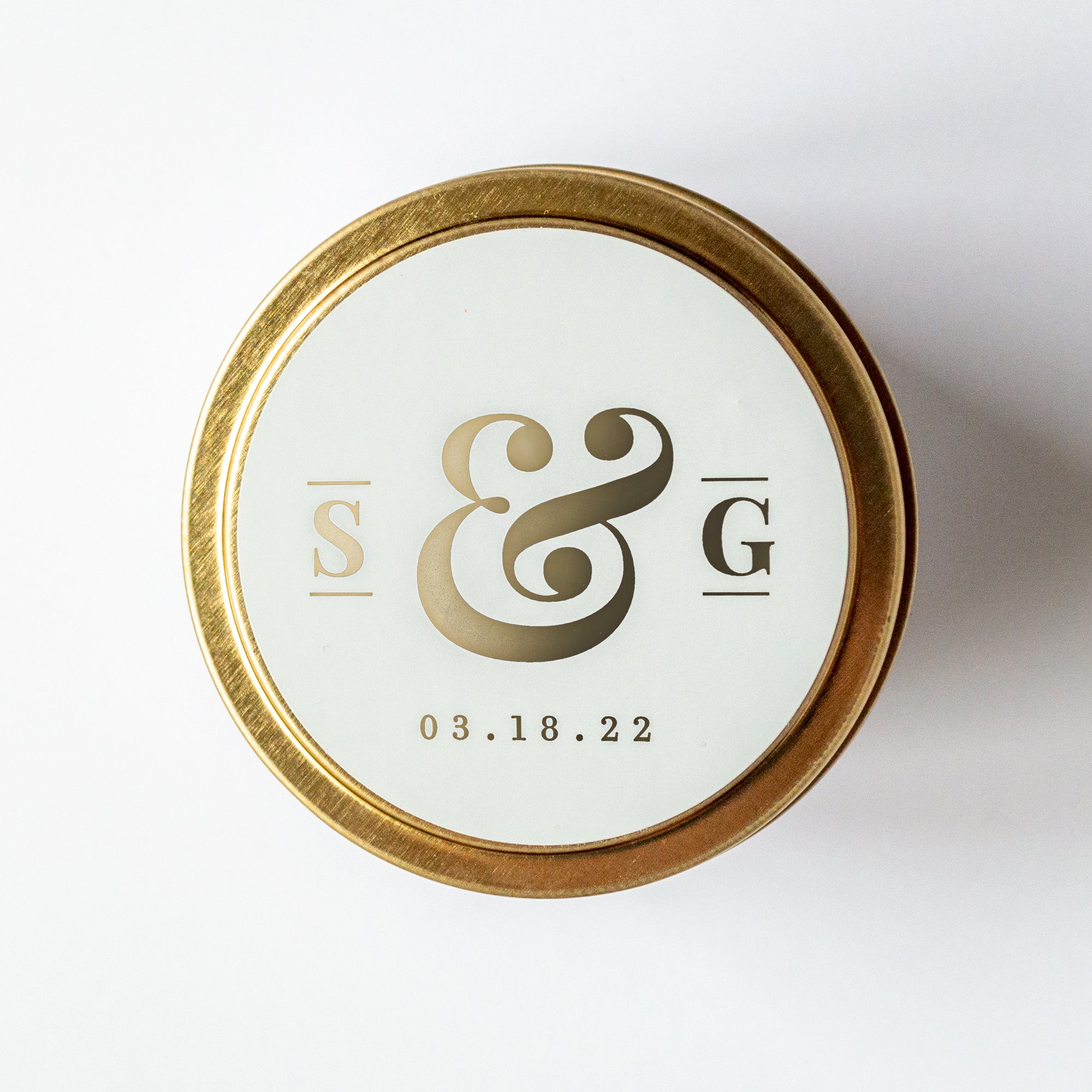 Each candle features a 4 oz. gold tin with lid. On the lid is a white circular label with an ampersand, your initials and your special event date. On the side of the tin is a white full-wrap label with candle information. Our warning label is on the bottom of the tin. Choose from metallic gold ink or black ink.